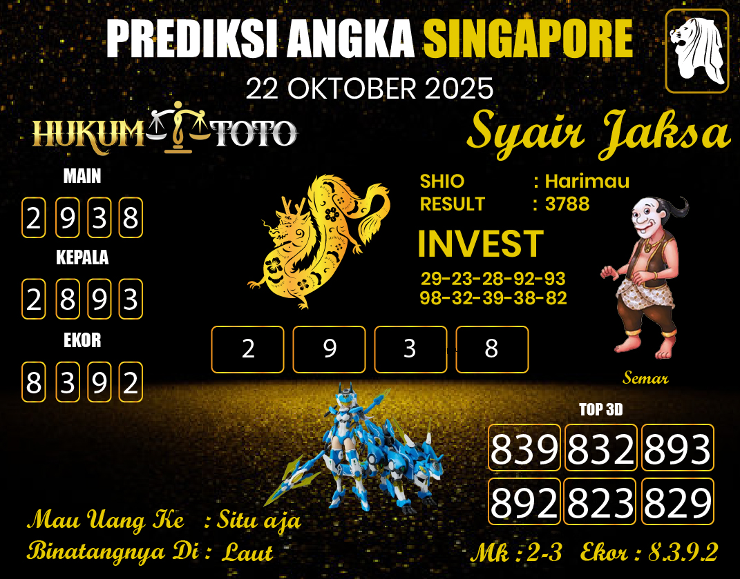 Mencari angka jitu keluaran singapore di Prediksi HukumToto terus-menerus selalu dapat membantu banyak bettor. Lantaran, bukan cuma siapkan result togel dan prediksi togel yang komplet dari beberapa pasaran, di Prediksi HukumToto pula kalian dapat mendatangkan atau menganalisis buku mimpi togel, di mana semasing tipe mimpi yang pas abjad diartikan pada tipe angka. Baik itu buku mimpi 2D, 3D hingga sampai 4D.